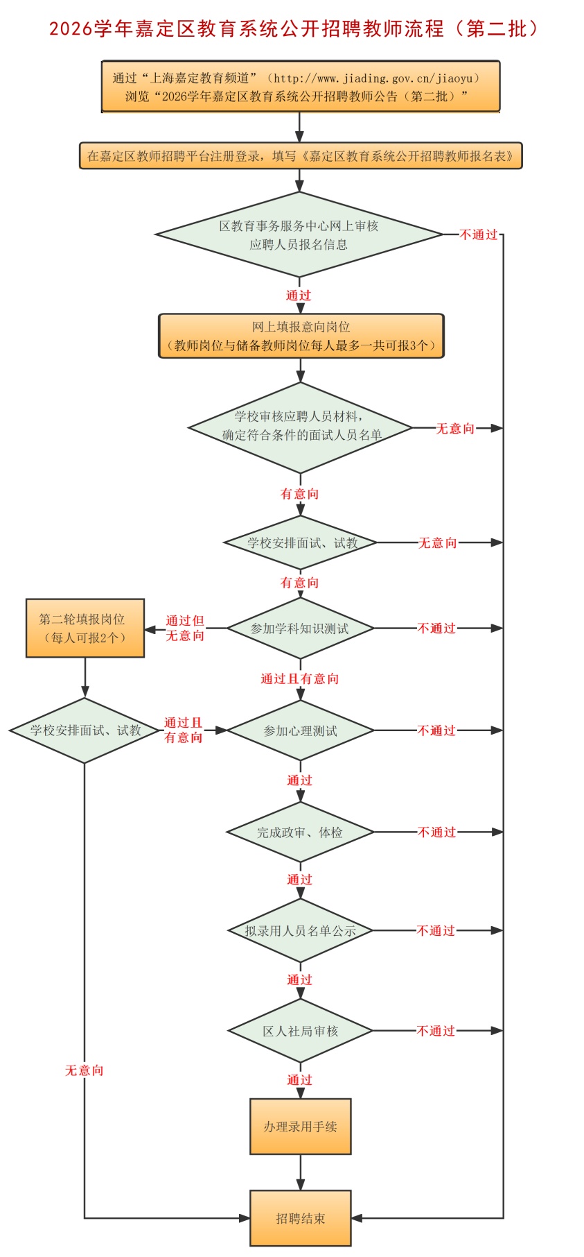 一、招聘对象和条件 (一)招聘对象 符合条件的2026届应届毕业生及社会人员。 备注:根据《上海市人力资源和社会保障局等五部门关于优化调整高校毕业生参加本市招考(聘)工作有关事项的通知》(沪人社就〔2024〕309 号),本市事业单位招收应届高校毕业生的,应一并向毕业证书落款年度2年内(含毕业当年度)未落实编制内工作的高校毕业生开放,不对其是否有工作经历、缴纳社保作限制;应届毕业生身份认定以本人毕(结)业证书落款年度为准(不含跨年结转毕)。本市出台新规定的,从其规定。 (二)基本条件 1.遵守中华人民共和国宪法和法律,拥护中国共产党的领导,热爱教育事业,具有良好的品行。 2.身体、心理健康,仪表端庄,具有教师任职的基本素质。 3.具备教师资格证书、岗位所需学历、学位、专业和职业技能等。 (三)学历条件 应聘中小学教师应符合以下条件之一: 1.专业对口的硕士研究生及以上学历毕业生; 2.专业对口的师范类高校本科毕业生(省部级师范类高校优先); 3.专业对口的其他高校本科优秀毕业生(须提供相应证明材料)。 备注: *公费师范生按照市教委相关政策执行。 *境外学历须经教育部认定,同时提供学历认证报告。 *上海高校临时集体户口不视作上海户籍。 *为深入贯彻本市《关于促进优秀退役军人到中小学任教的实施意见》,对于符合条件的优秀退役军人,同等条件下优先考虑。 (四)证书条件 1.应届毕业生 (1)持有相应的教师资格证。暂未持证的,可提供教师资格证笔试成绩合格证明或面试成绩合格证明,符合师范生免试认定教师资格证的可暂不提供。以上人员均须承诺在办理录用手续前取得教师资格证(承诺书样张详见材料清单)。教育部与市教委如有新规定的,从其规定。 (2)应聘者须具有相应的学位证书。 (3)应聘英语学科需达到大学英语六级或专业英语四级及以上,国外高校毕业生如无上述证书,需提供雅思6分及以上或托福95分及以上证明材料。 (4)普通话须二级乙等及以上,应聘语文学科普通话须二级甲等及以上。 (5)年龄一般不超过40周岁(1986年7月31日以后出生)。综合考虑服役年限等因素,符合条件的优秀退役军人应聘年龄可放宽2年(1984年7月31日以后出生)。 2.社会人员 (1)持有相应的教师资格证。 (2)应聘者须具有相应的学位证书,若应聘者拥有一级教师(中级)及以上职称,可适当放宽。 (3)应聘英语学科需达到大学英语六级或专业英语四级及以上,国外高校毕业生如无上述证书,需提供雅思6分及以上或托福95分及以上证明材料。 (4)普通话须二级乙等及以上,应聘语文学科普通话须二级甲等及以上。 (5)年龄一般不超过40周岁(1986年7月31日以后出生)。综合考虑服役年限等因素,符合条件的优秀退役军人应聘年龄可放宽2年(1984年7月31日以后出生)。 (6)须一直从事教育教学工作,优先考虑区级骨干教师或在区级及以上教育教学活动中获奖的优秀教师。 3.根据《关于新时代嘉定加强教育和卫生健康高素质人才队伍建设的若干意见》和《嘉定区教育系统高素质人才队伍建设激励机制实施细则》相关文件精神,实施高素质教育人才(学科领军人才、特级校长、特级教师、正高级教师、骨干教研员、博士和博士后、中青年学术骨干等)招聘。经主管部门审核,高素质教育人才年龄可放宽。 二、招聘流程
