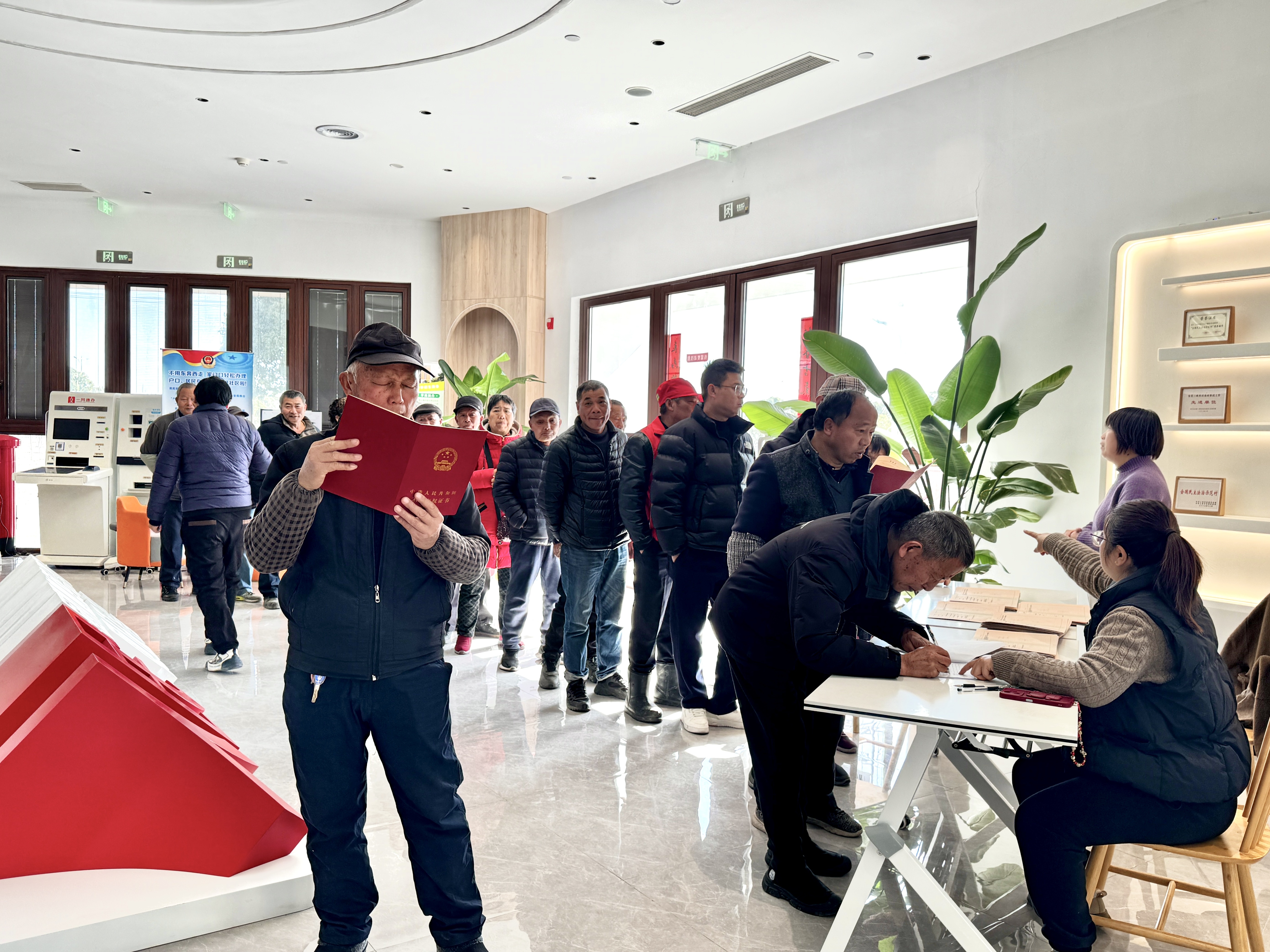 当天上午9时,村民们早早聚集在发放点排起长队,工作人员有序引导大家完成身份证明核验、签字登记等手续,现场洋溢着欢声笑语。“搬进新居两年,居住环境宽敞了,邻里乡亲也还在身边,如今有了‘大红本’,心里才真正踏实,住得更安心了!”村民金阿姨捧着证书反复端详,难掩激动。村民周阿姨则为便捷服务点赞:“从办证到领证,镇里统一帮着跑手续,最后还送到‘家门口’,真是太方便了!”