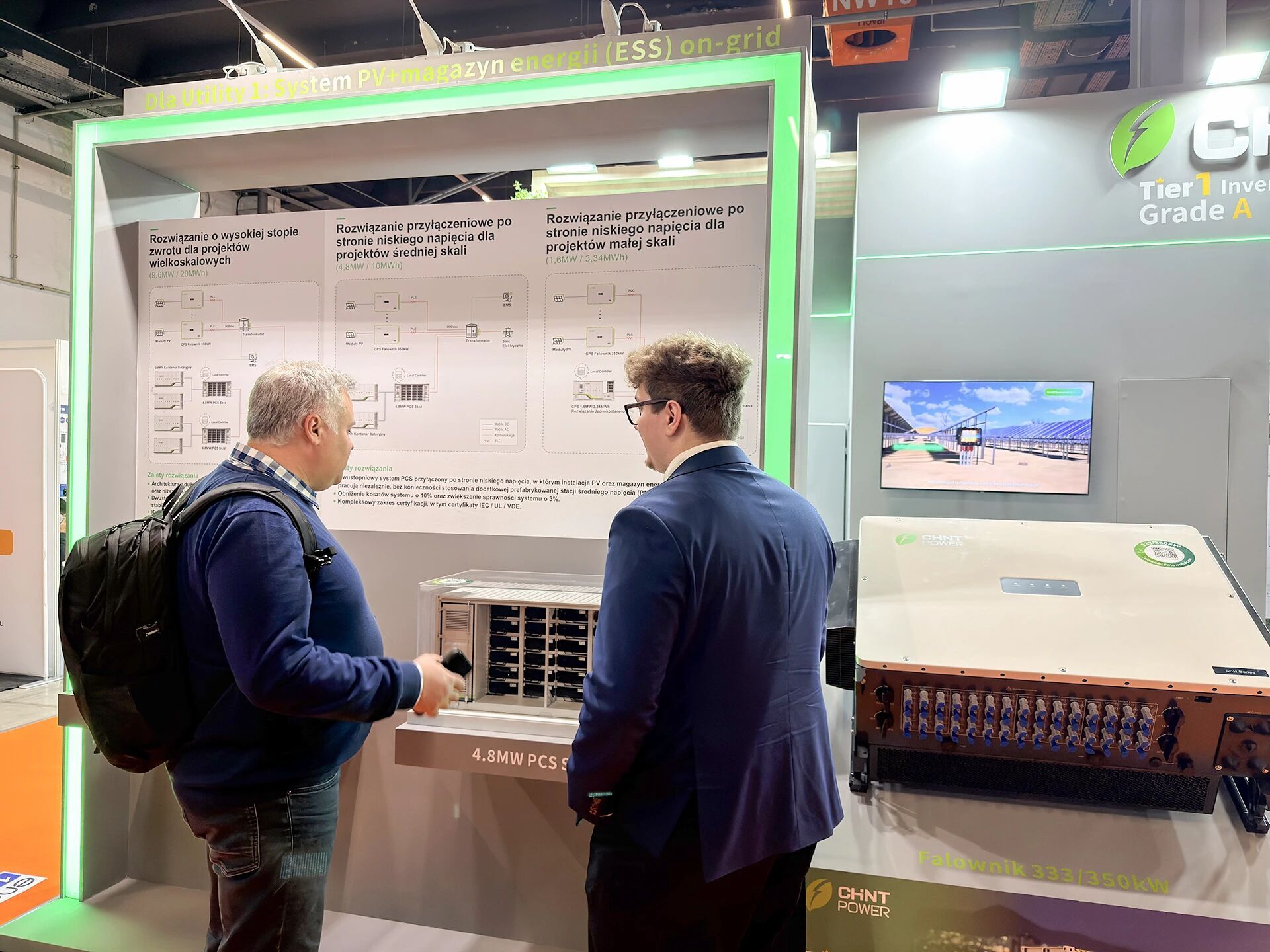 展会现场客商络绎不绝,洽谈氛围火热。围绕“更高效、更安全、更可靠”的设计理念,正泰电源以5MWh电池舱、4.8MW变流舱及350kW逆变器为核心产品矩阵,系统展示面向大型地面电站的全场景光储应用,吸引众多海外客户驻足咨询。