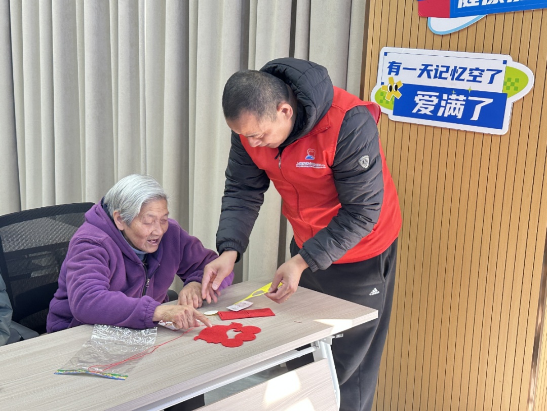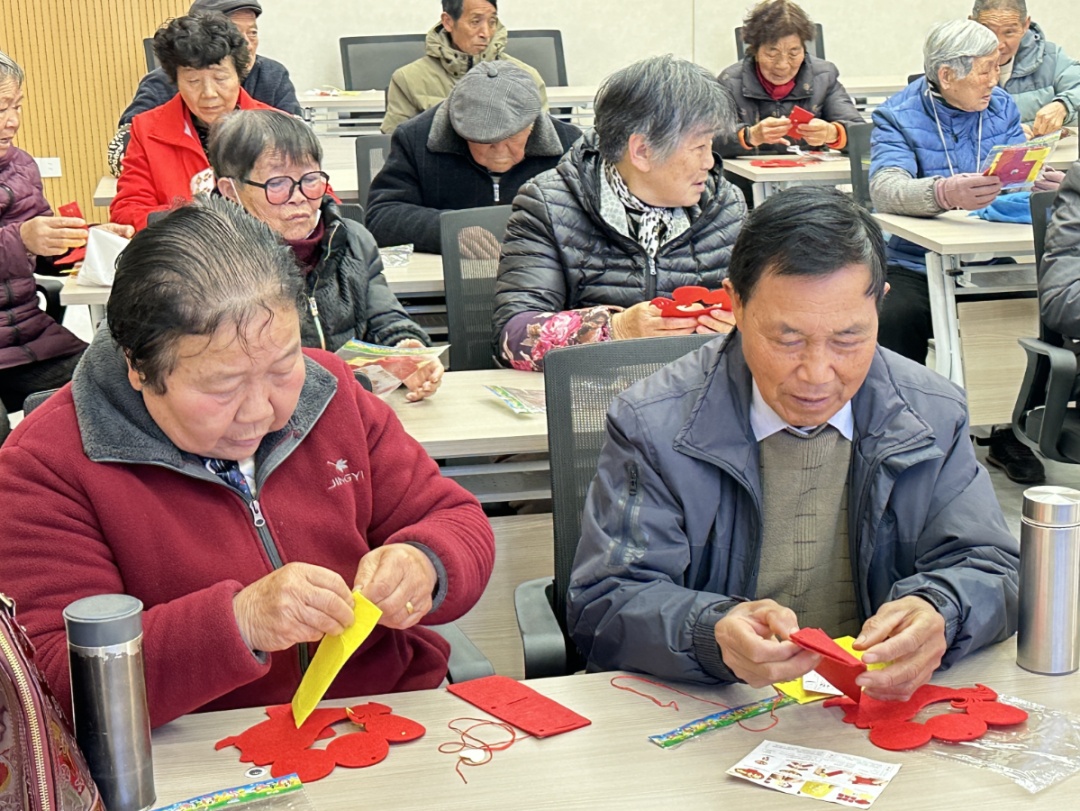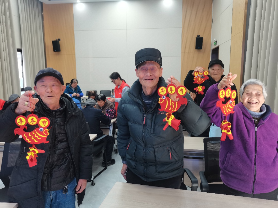 在志愿者的带领下,老人们亲手制作寓意吉祥的“年年有鱼”手工作品。通过拼接、粘贴、组装,一条条色彩斑斓的“锦鲤”在老人们手中逐渐成形。整个过程既锻炼了手眼协调能力,也激发了大脑活力,老人们在动手动脑中收获了快乐与成就感。