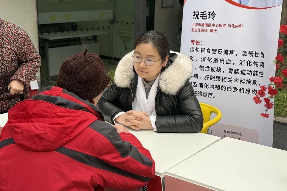 随后,杨浦区中心医院派出的专家团队现在为居民提供一对一免费问诊服务。来自神经内科、疼痛科、心内科、骨科、内分泌科等十余个专科的资深专家悉数到场,诊台前排起了有序的队伍。