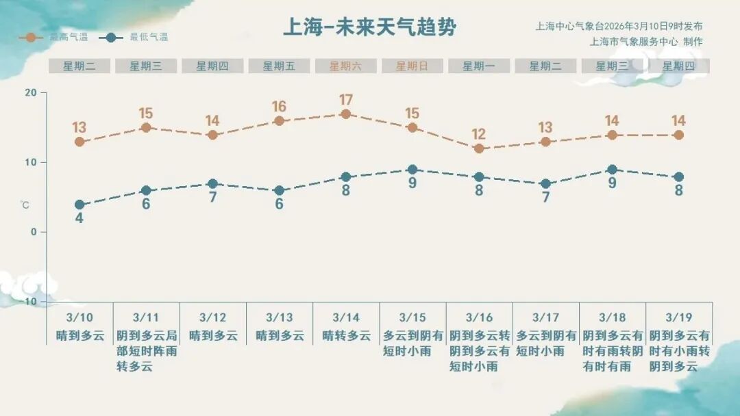 上海中心气象台预计,未来一周上海天气节奏变化较快。周三起本市云量会逐渐增多,下午起部分地区将迎来短时阵雨,不过雨水来得快去得也快,到夜间就会逐步停止,转为多云。气温相比今天略有上升,在6~15℃左右。