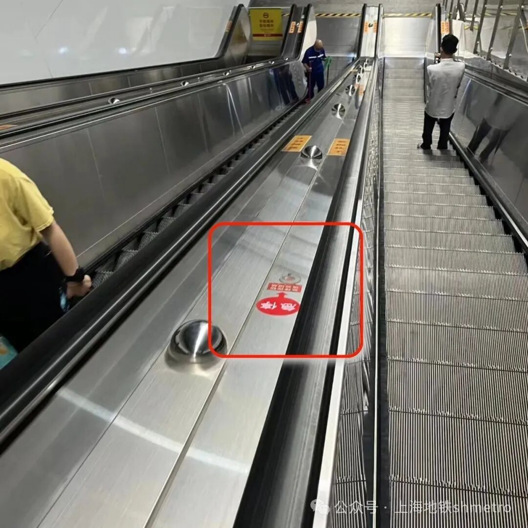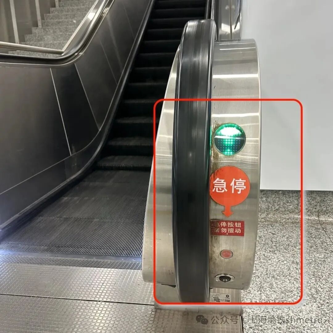 搭乘自动扶梯时 有哪些地方需要注意呢? 以下这份乘坐自动扶梯安全小贴士 01 乘坐自动扶梯 这些区域要注意 自动扶梯梳齿板与梯级、围裙板与梯级、梯级与梯级的间隙,容易卷吸衣服裙摆或材质柔软的鞋子,请勿在这些区域站立或停留。 02 以下这份安全乘梯指南请收好! ①乘坐自动扶梯前,请确认好扶梯运行方向并系好鞋带,避免穿着材质柔软的洞洞鞋。 ②穿着宽松衣物时,注意不要接触到缝隙,以免被扶梯夹住。 ③乘坐自动扶梯时,请站稳扶好,身体与扶梯侧板保持一定安全距离,不要倚靠侧板及扶手带。请集中注意力,不要低头看手机或探身观望,到达出口处应迅速离开,防止造成拥堵或跌倒摔伤。 ④携带大件行李乘坐扶梯时,容易因行动不便导致摔倒或行李滑落伤人。为保护自身及他人的安全,携带大件行李,使用轮椅车、婴儿推车或行动不便的乘客,请选择乘坐无障碍电梯,或向地铁工作人员寻求帮助。 03 自动扶梯上有人摔倒 或发生意外情况该怎么办? 自动扶梯上如果发生乘客摔倒、梯级夹人夹物等紧急情况,应提醒扶梯上其他人站稳扶好,随即按下自动扶梯紧急停止按钮,扶梯会立刻减速并停止运行,避免造成更严重的伤害。 自动扶梯紧急停止按钮通常安装在自动扶梯两端的右下方,以及长大型扶梯的中部。按钮为醒目的红色,有嵌入式、凸出式等,按钮附近标注有“急停”“停止”等字样。 请大家注意,在非紧急情况下,请不要误按紧急停止按钮!