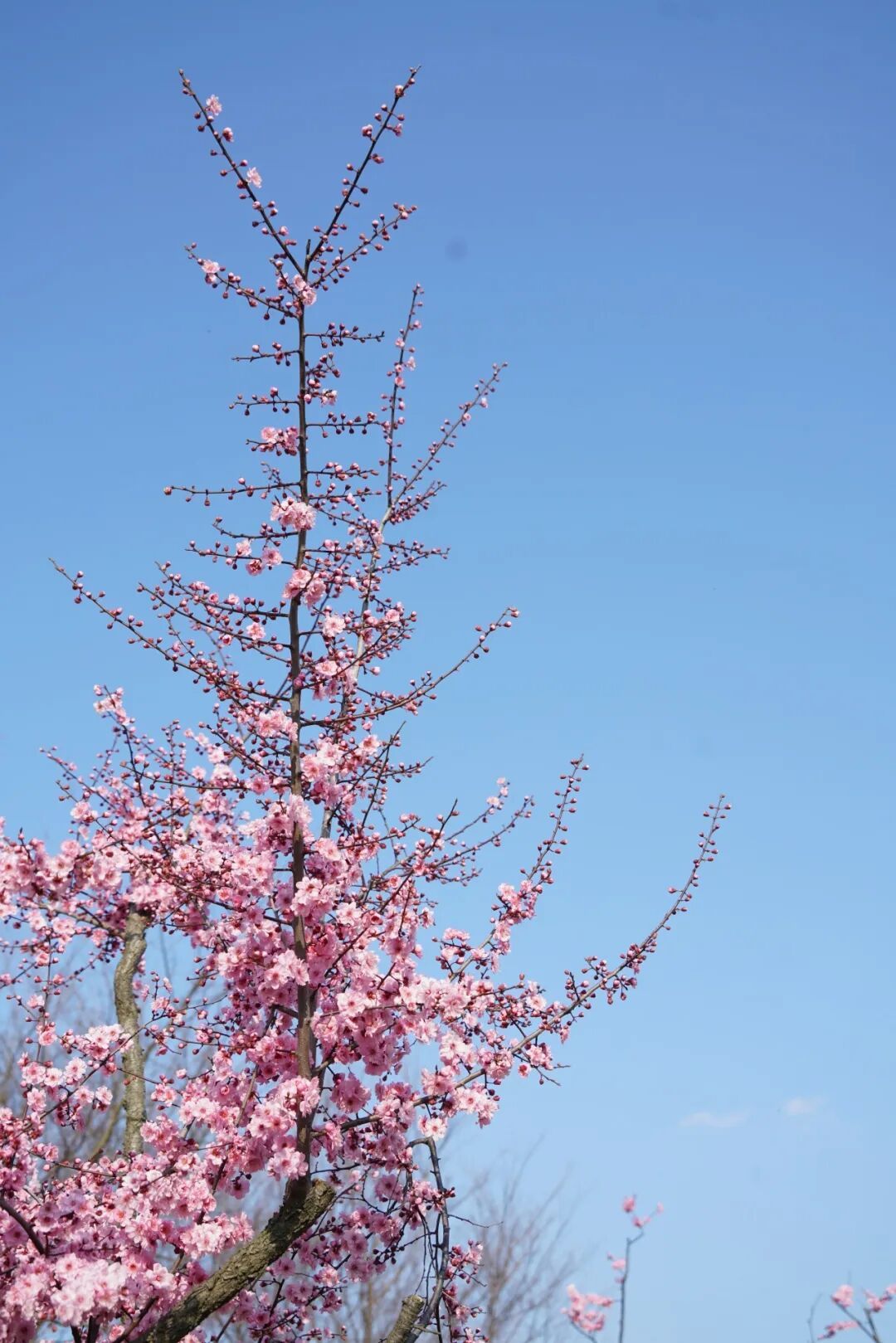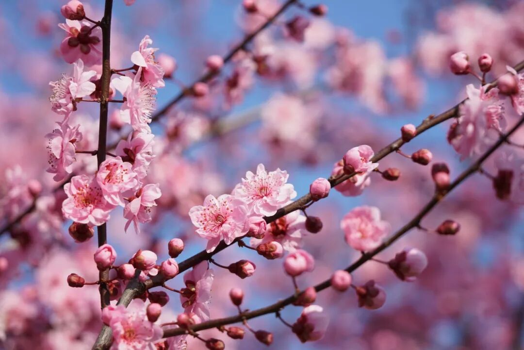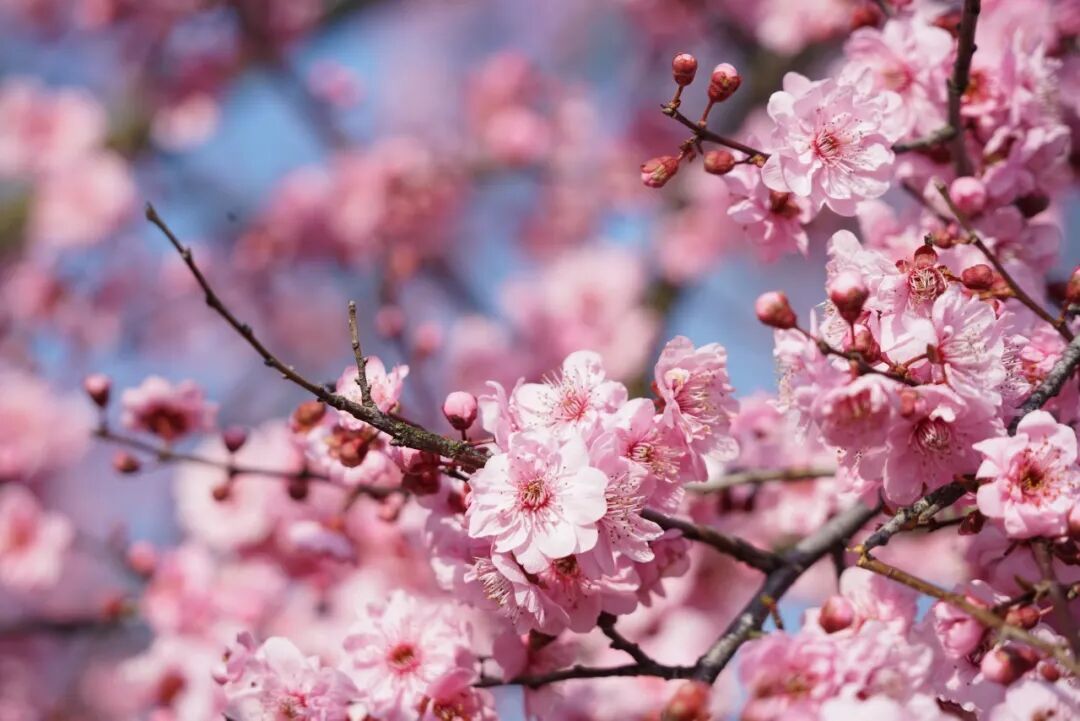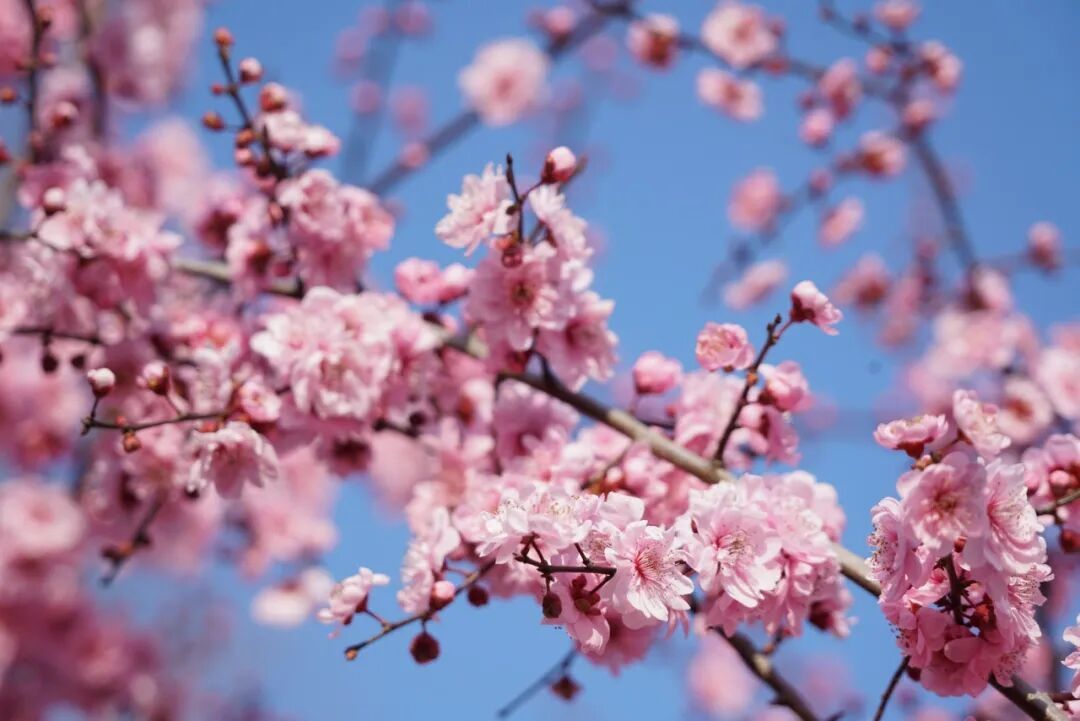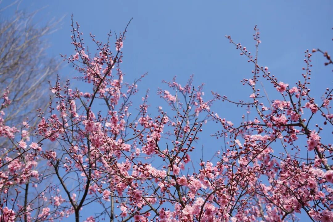 红梅热烈如火,远望如一片绯红的云霞落在水中央;走近了看,枝头点点红蕊,衬着初春湛蓝的天空,随手一拍,便是春意盎然的画面。