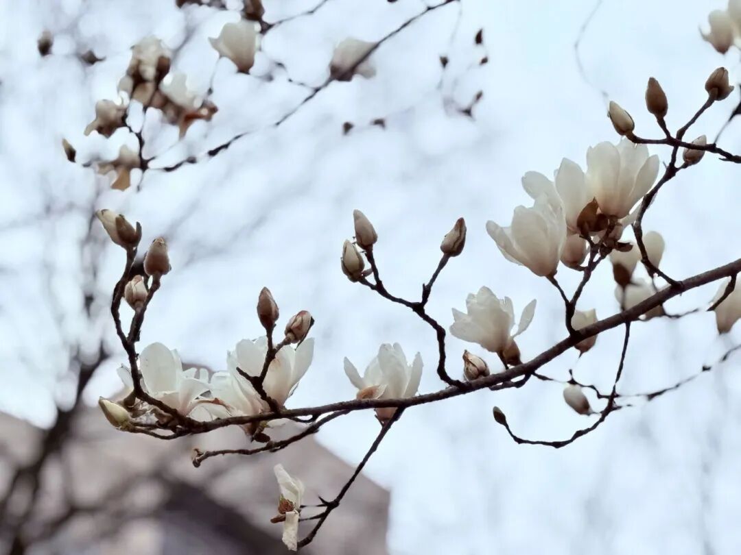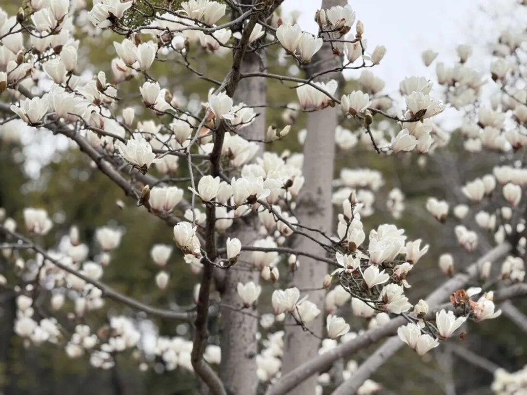 青浦白玉兰广场的这几棵玉兰树也如约盛放,奶白、莹润的花瓣层层缀满枝头,春风阵阵拂过,花枝轻轻颤动,花瓣簌簌飘落。