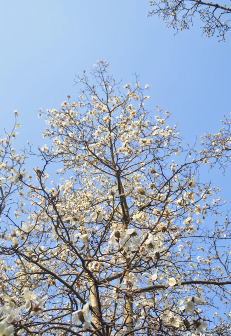 站在花树下抬头望去,蓝天为底,白花缀饰,清雅香气丝缕隐约,让人心旷神怡。
