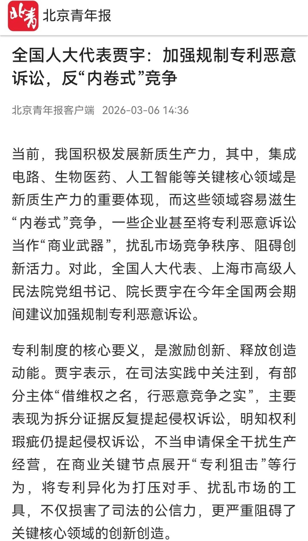 全国人大代表贾宇:加强规制专利恶意诉讼,反“内卷式”竞争