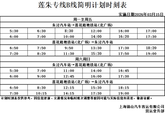 为进一步提升朱泾工业区公共交通服务水平,精准覆盖企业员工的通勤需求,自2026年3月15日(周日)起新辟莲朱专线B线,具体如下:
