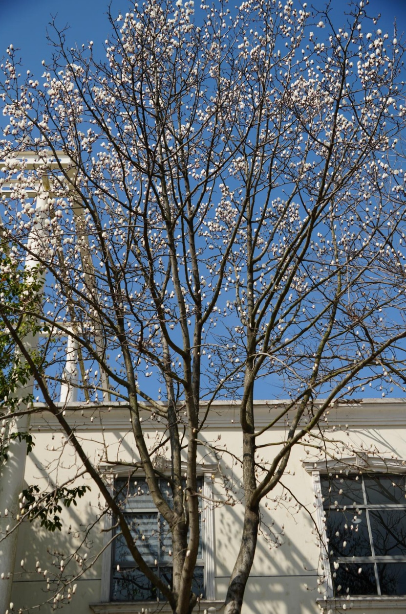 万春苑村委会旁的白玉兰尤为引人注目,植株高大挺拔,足足有三层楼高。