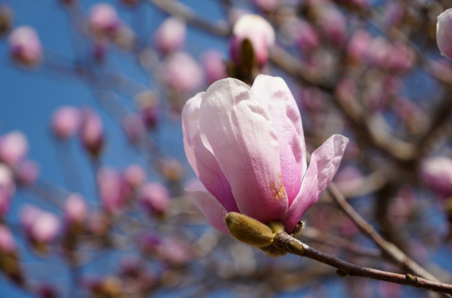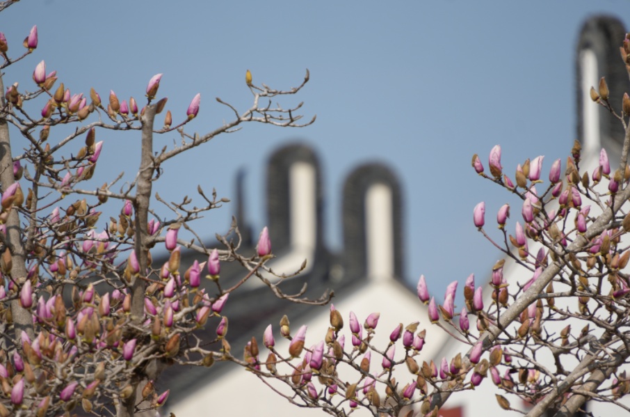 廊下镇社区党群服务中心西边停车场边,粉玉兰正铆足劲努力绽放,如淡淡烟霞,近看花瓣粉白相间,色泽柔和。白色植株花瓣洁白厚实,在阳光下熠熠生辉,吸引着来来往往的居民驻足观赏。
