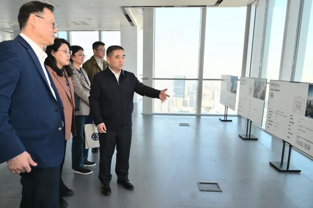 会前,区领导一行登高察看南京西路—苏河湾中央活力区(CAZ)整体情况,听取功能片区部分重点楼宇情况汇报。