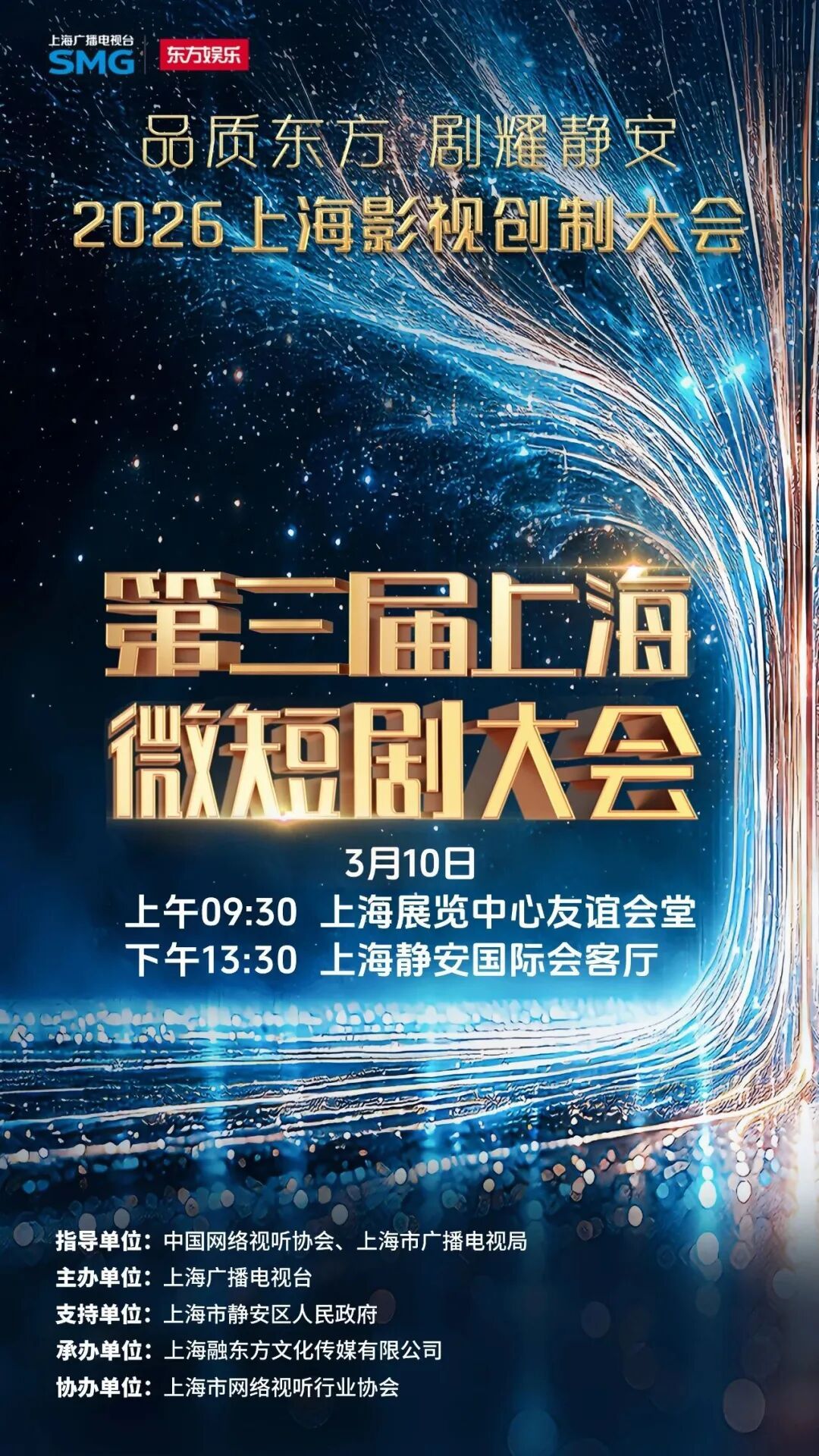 3月10日,第三届上海微短剧大会在上海展览中心友谊会堂举行。上海市委常委、宣传部部长赵嘉鸣,国家广电总局网络视听节目管理司副司长洪英出席会议。本届大会由中国网络视听协会、上海市广播电视局指导,上海广播电视台主办,静安区人民政府支持,上海融东方文化传媒有限公司承办,上海市网络视听行业协会协办。