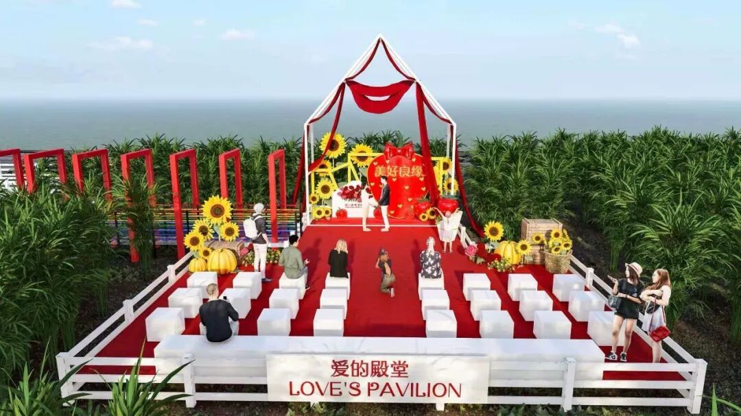 登记点室内空间设计注重功能与仪式感的结合,从寓意“节节高”的楼梯,到巨大的“喜”字装饰,再到温馨的等候区和办证区,处处体现对新人的祝福。户外则依托田园风光,规划了草坪婚礼区、许愿树以及随着季节变换的油菜花、小麦、水稻等景观,力求为新人提供独一无二的自然浪漫体验。