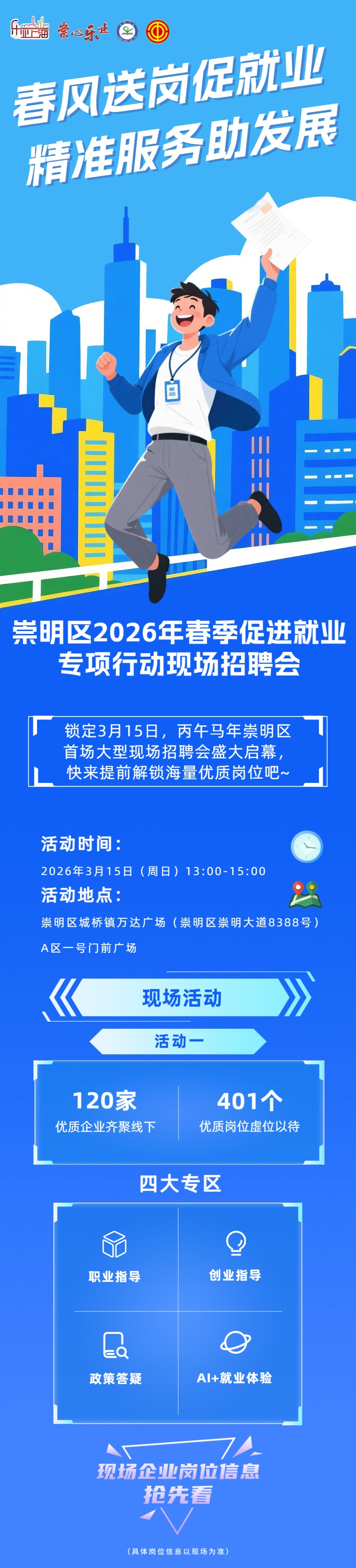 区人力资源社会保障局将联合有关部门举办崇明区2026年春季促进就业专项行动现场招聘会。海量优企好岗,“职”等你来!