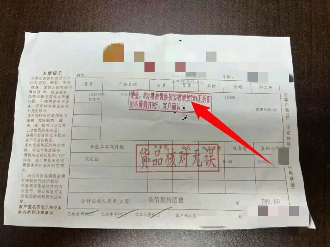 “严女士回忆,整个消费过程,店家没有告知其购买的是‘一口价’商品。根据手镯的售价和当时的金价折算,严女士认为手镯重量在10克左右,才决定购买。可回家后,她感觉手镯重量不对劲,就仔细查看了收据,据她本人说,当时的心情‘如晴天霹雳’。”周恺说,最关键的“重量”一栏,字体非常小,且被一个红色粗体章牢牢覆盖,拿放大镜仔细辨认后才发现,仅有6.94克,比她的旧金少了近四成,约4.5克,按照当时金价计算,差价约5000元。