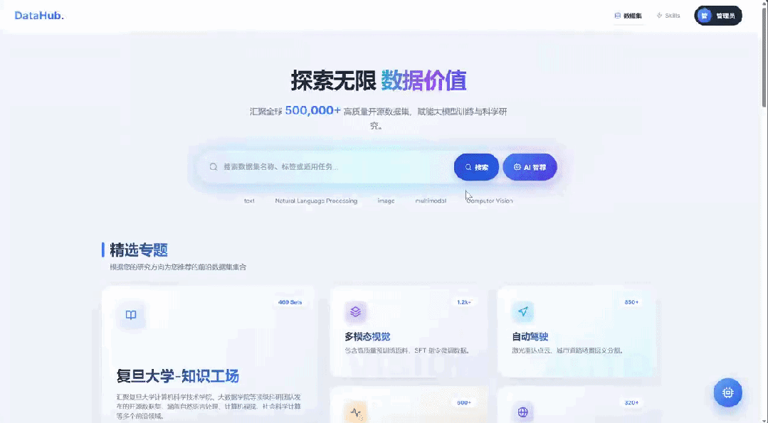 DataHub是由上海市数据科学重点实验室DataHub团队研发的数据集智能发现与评估平台,由“数据集平台”与“智能体技能平台(DataHub Skills)”双引擎构成。