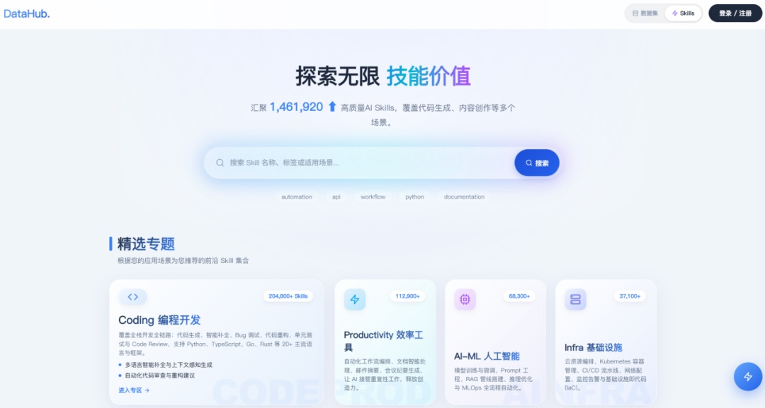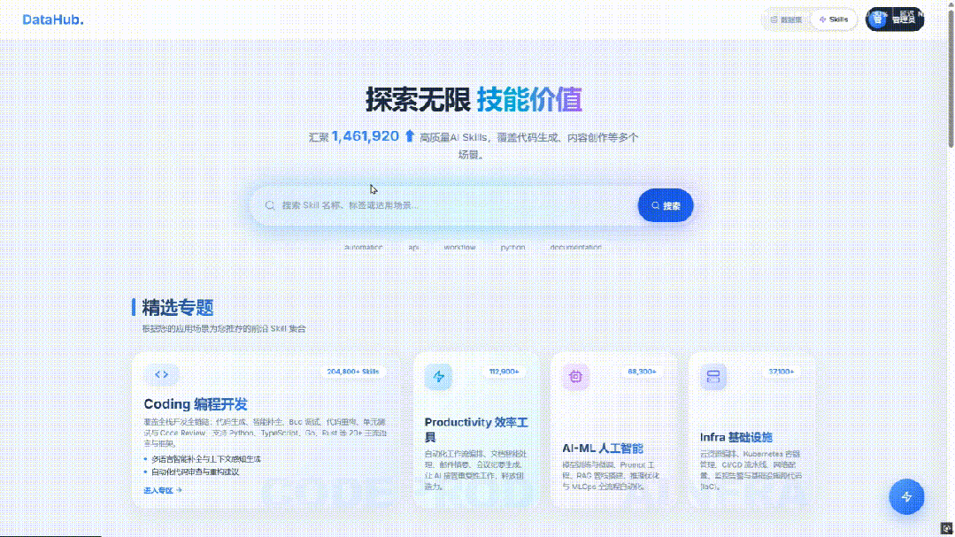 告别传统“只管收录、不管死活”的静态资源库模式,DataHub Skills构建了一个鲜活的百万级Agent技能生态平台。