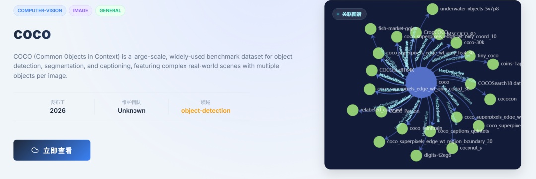 在数据集侧,DataHub已沉淀51万+高质量开源数据集,并围绕数据集持续构建知识图谱、论文关联、任务关联、方法关联与版本演化信息。用户在平台上看到的,不只是一个下载入口,而是一个更完整的数据上下文:这个数据集适用于什么任务,被哪些论文使用过,与哪些方法相关,又是否仍在持续演进。