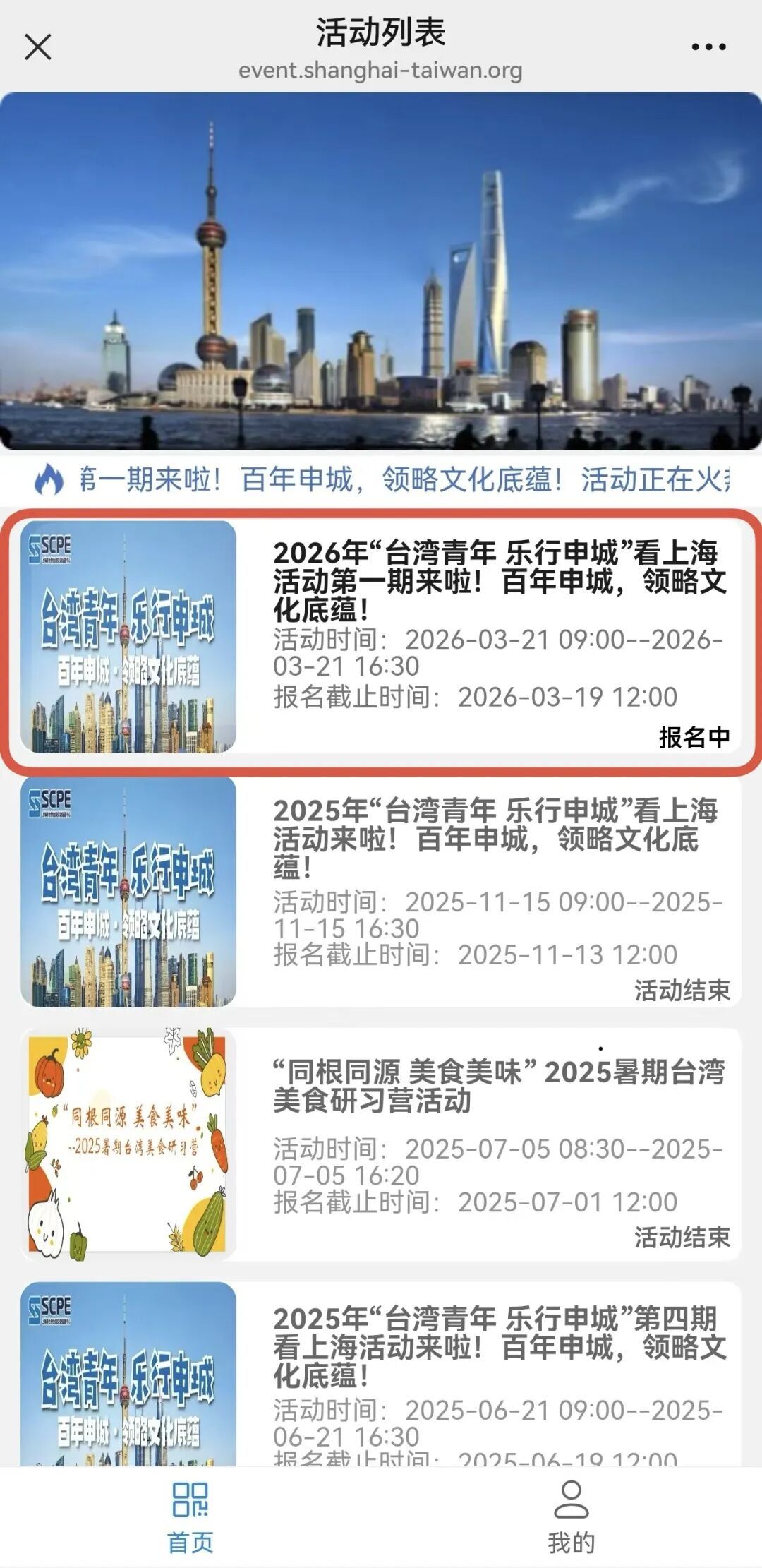 2、从底部菜单栏进入“活动报名”页面,选择“2026年‘台湾青年 乐行申城’看上海活动第一期”,提交报名信息。