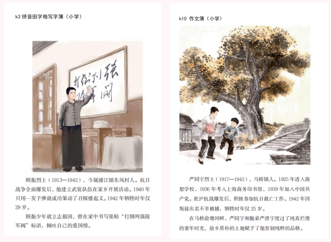 小学阶段聚焦顾振、严同宇、侯伯泉、赵季昌等闵行本土英烈,以彩色漫画配简洁文字讲述先烈们艰苦奋斗、舍生取义的爱国故事。
