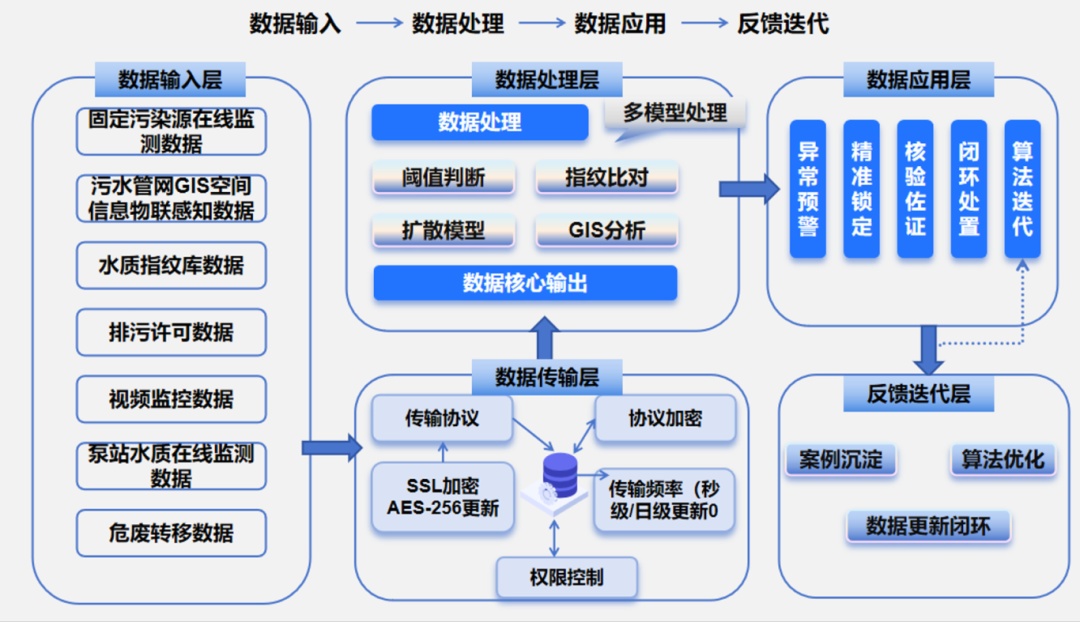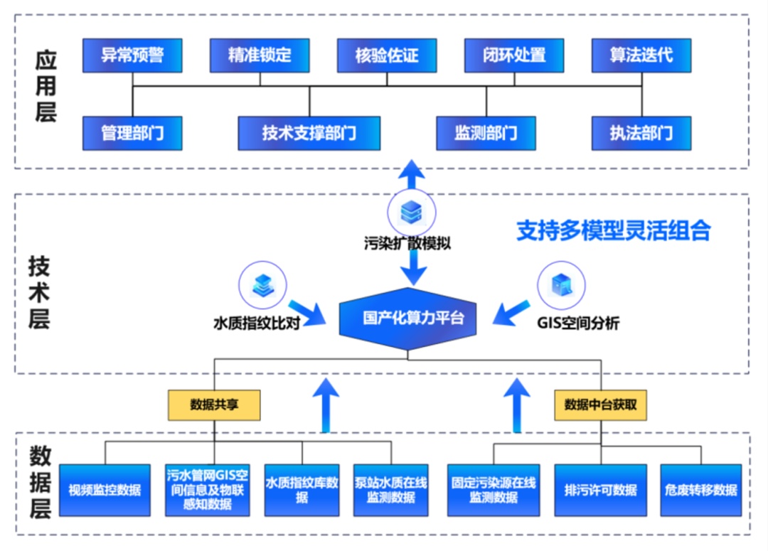 系统采用“复用现有资源+轻量化部署”三级架构,无需大规模新建基础设施。数据层整合污染源在线监测、管网GIS空间信息等7类现有成熟数据,直接调用政务数据中台接口;技术层基于国产化算力平台开发耦合算法引擎,集成水质指纹比对、污染扩散模拟等子模型,支持多模型灵活组合;应用层设置异常预警、精准溯源等5大核心模块,实现多部门各司其职、高效协同。