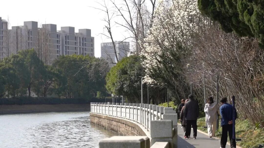 步道上,过路市民纷纷驻足欣赏,有人举起手机寻找最佳角度,还有家长牵着孩子数着花瓣,笑声与花香交织。“天气好我都会来这里晨练,这几天玉兰开了,景色特别美。”市民翁女士拿起手机定格美景,笑着说,“每年这个时候我都会来拍点照片,记录下春天的样子,像和老朋友见面一样。”