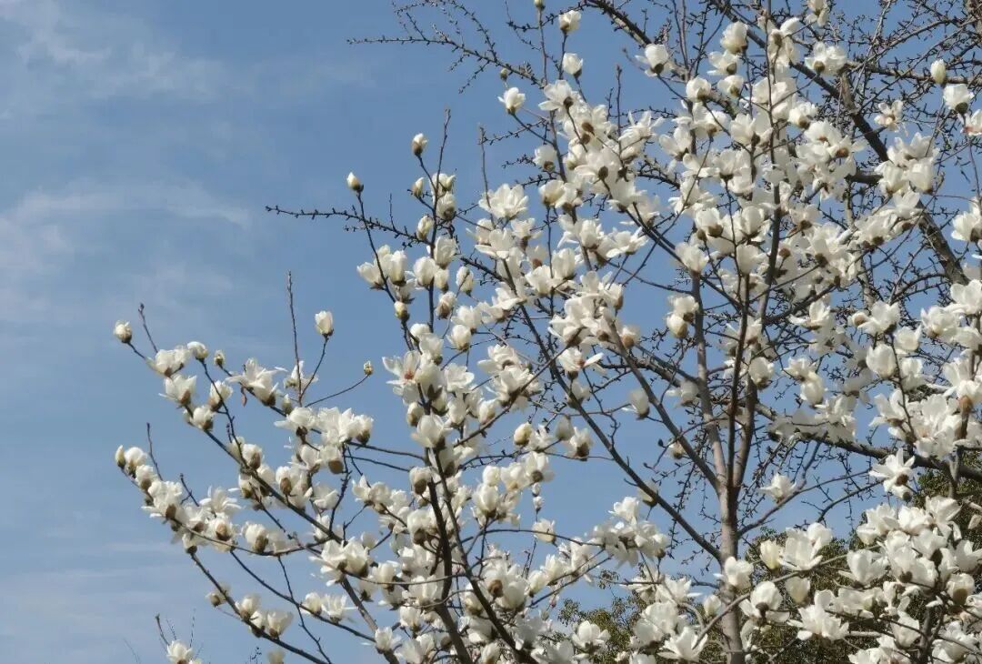 走近细看,朵朵玉兰花优雅而浪漫:有的含苞待放,犹如少女含羞的笑颜;有的盛开如白玉明珠,在春风中轻轻摇曳,仿佛云朵漂浮枝头。