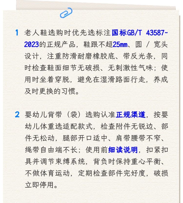 市市场监管局介绍,“3·15”国际消费者权益日来临之际,市场监管总局发布老人鞋和婴幼儿背带(袋)2类产品消费提示,旨在通过介绍产品选购和使用方面的常识,帮助广大消费者科学购买和使用相关产品,筑牢安全防线。