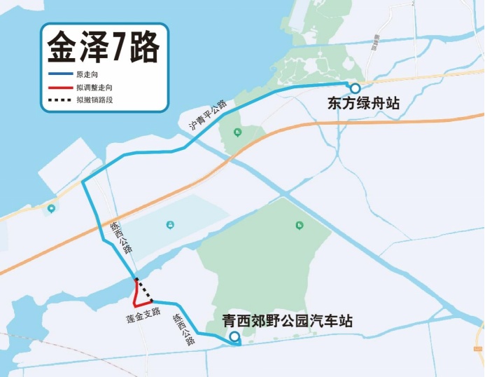 拟调整为:上行自东方绿舟站起经沪青平公路、练西公路、莲金支路、练西公路至青西郊野公园汽车站止;下行自青西郊野公园汽车站起经练西公路、莲金支路、练西公路、沪青平公路至东方绿舟站止。