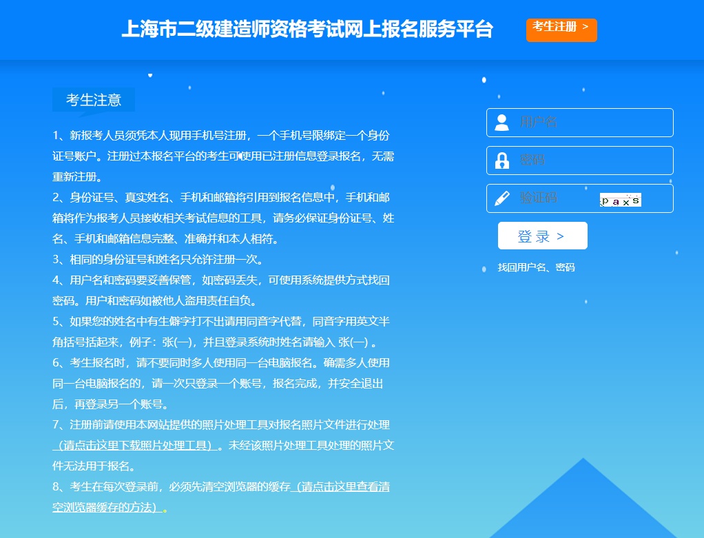 1.新报考人员须凭本人现用手机号注册,一个手机号限绑定一个身份证号账户。注册过本报名平台的考生可使用已注册信息登录报名,无需重新注册。