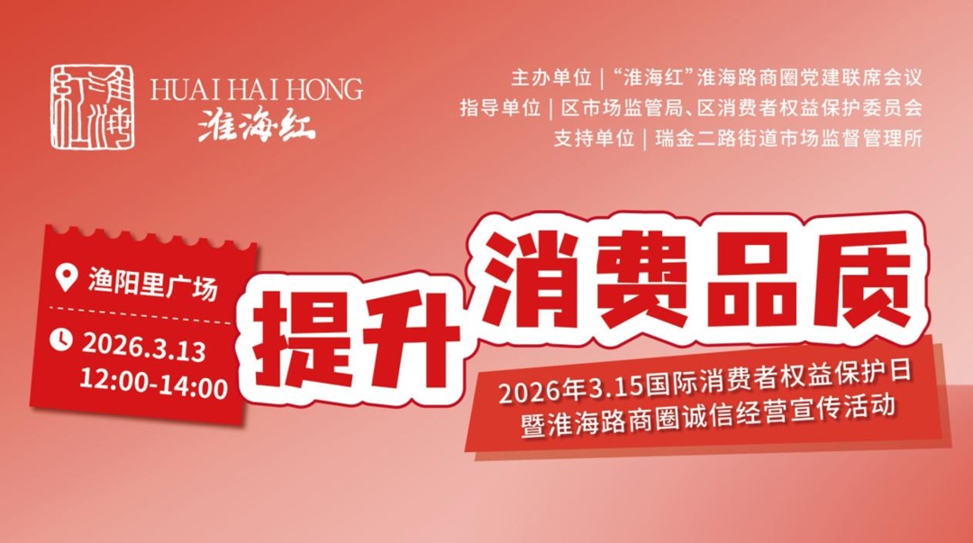 为持续优化商圈消费生态、着力提升消费品质,激发消费市场活力,“淮海红”淮海路商圈党建联席会议将举办2026年度“3·15”国际消费者权益保护日暨淮海路商圈诚信经营宣传活动。