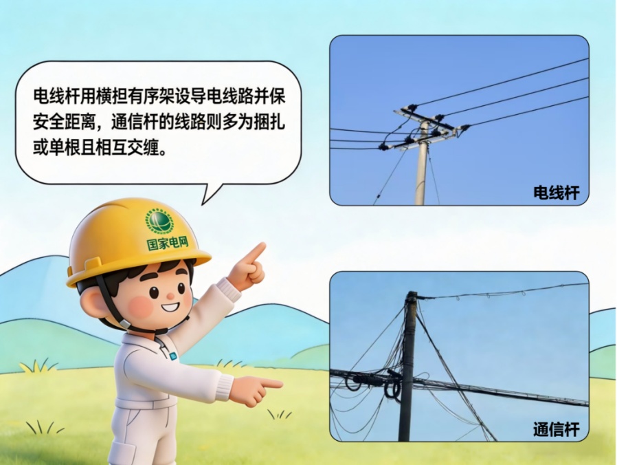 电线杆上的每一根导电线路在杆塔上都会保持一定的距离,并且有绝缘材料支撑,而通信杆上的线路往往会相交在一起。
