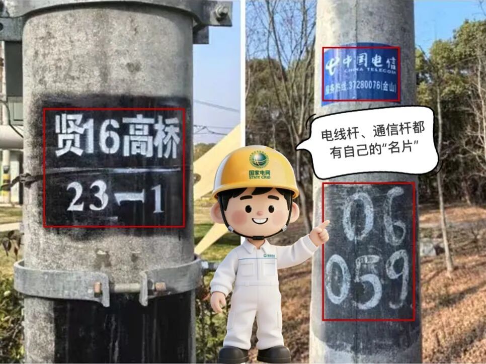 就像每个人都有身份证一样,电线杆和通信杆也有自己的“名片”。电线杆上通常标有杆塔的名称以及编号。通信杆上则可能有“中国电信”“中国移动”等运营商标识。