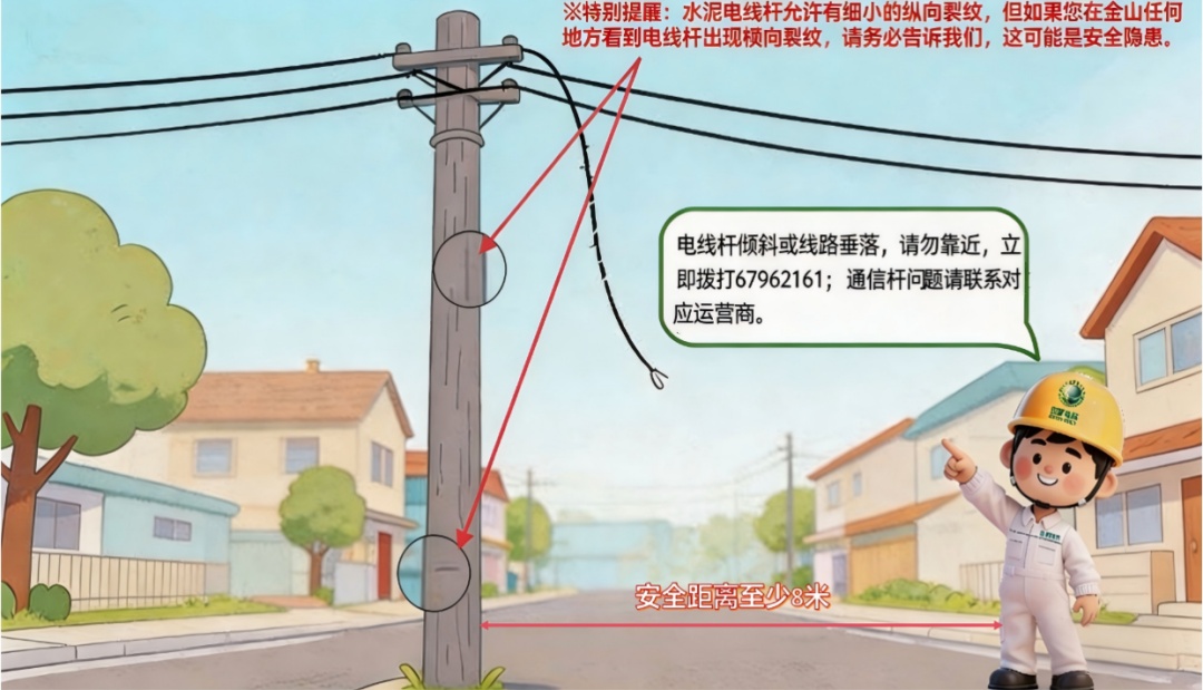 如果在金山任何地方,看到电线杆出现横向裂纹、倾斜、线路垂落,千万别靠近,至少要远离8米以上,并立即拨打“67962161”。如果是通信杆的问题,可以联系相应的运营商。