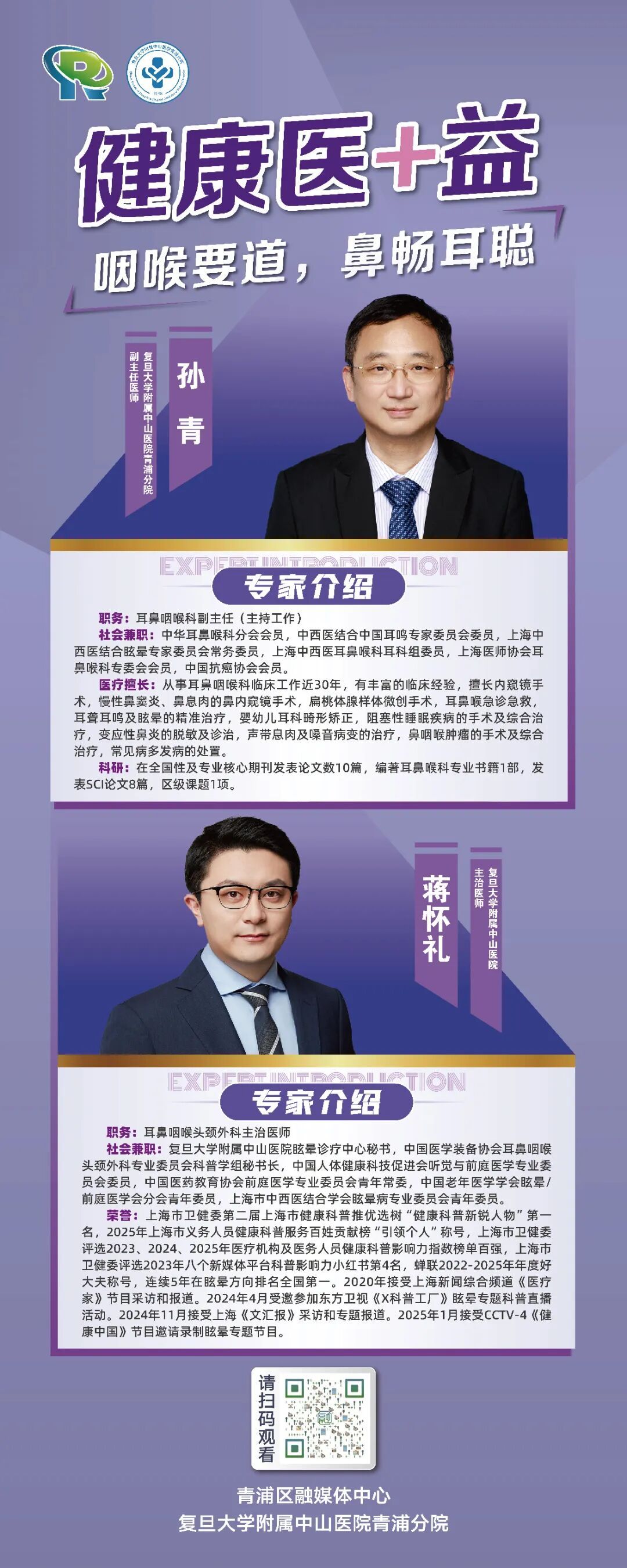 我们请来了复旦大学附属中山医院蒋怀礼主治医师和复旦大学附属中山医院青浦分院孙青副主任医师两位耳鼻喉科“大咖”,跟你聊聊那些让你崩溃的小毛病。