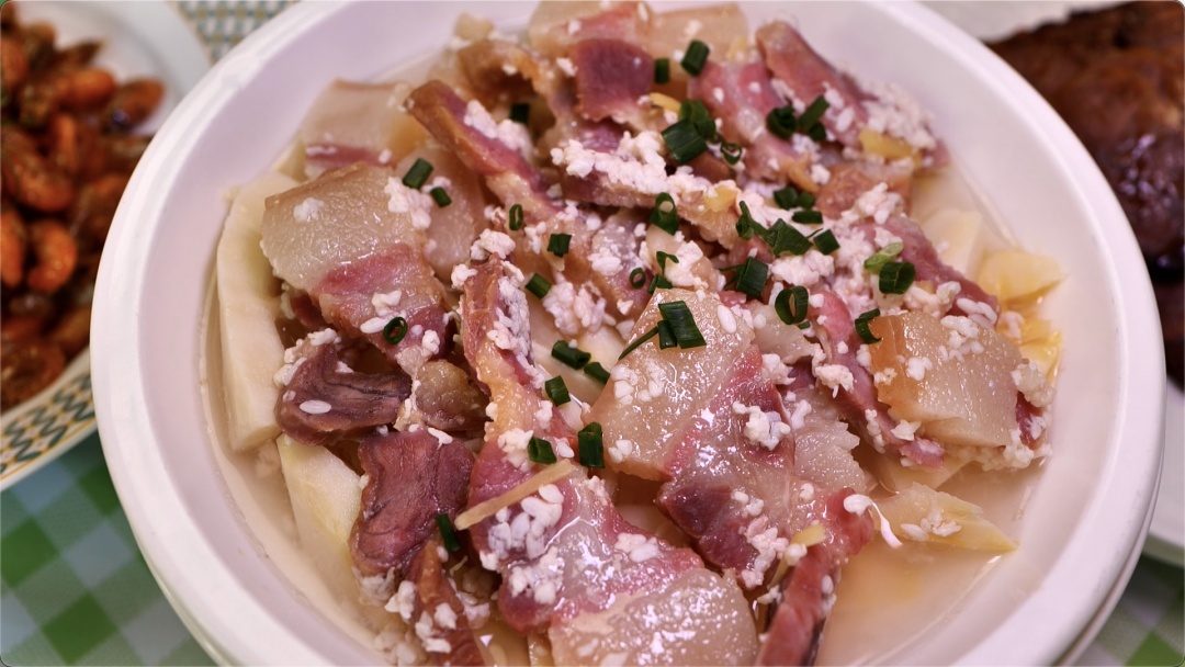 这道糟肉竹笋,用的是黑毛猪肉,蒸出来格外香。“这是老板娘的爸爸祖上传下来的,酒糟的香气,咸肉的醇厚,配上春笋,别有一番风味。”面对追问,兰郡酒店厨师李辉略带神秘地笑了,“具体配料不方便说,老祖宗传下来的。”