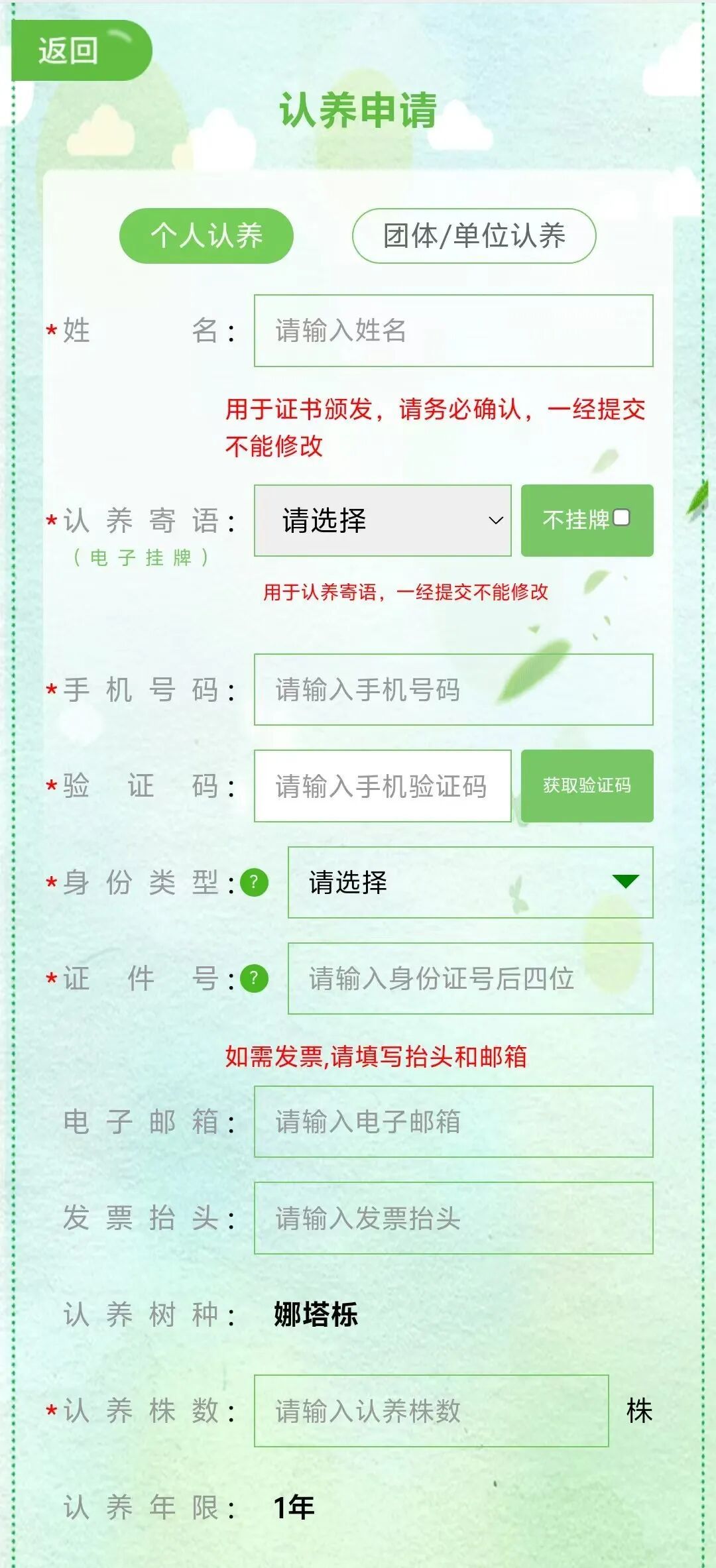 完成付款后,表示你已成功参与了本次全民义务植树活动。你可以点击“证书查询”,输入认养申请的手机号码后查看自己的认养证书。