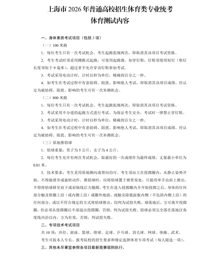 市教育考试院介绍,上海市2026年普通高校招生体育类专业统考将于3月14日(星期六)至15日(星期日)在上海体育大学进行〔考生从嫩江路1183号(北门)入场〕。考前请注意这些事项↓