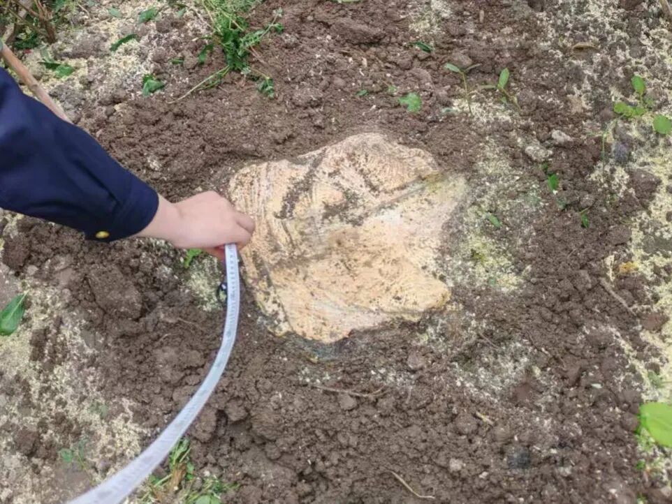 执法人员第一时间前往现场查看,发现该小区某处绿地内有一棵树木自根部离地5厘米处被砍断。现场未发现砍伐树木的当事人,物业工作人员指认小区内与被砍伐树木相同品种的树木,并指证砍伐者丢弃树干、树枝处,执法人员进行现场勘查测量。