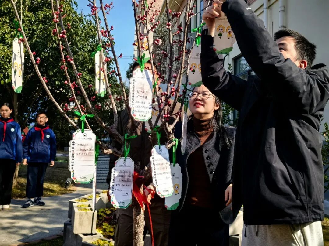 教师们为新栽杏树挂上教育家精神名言