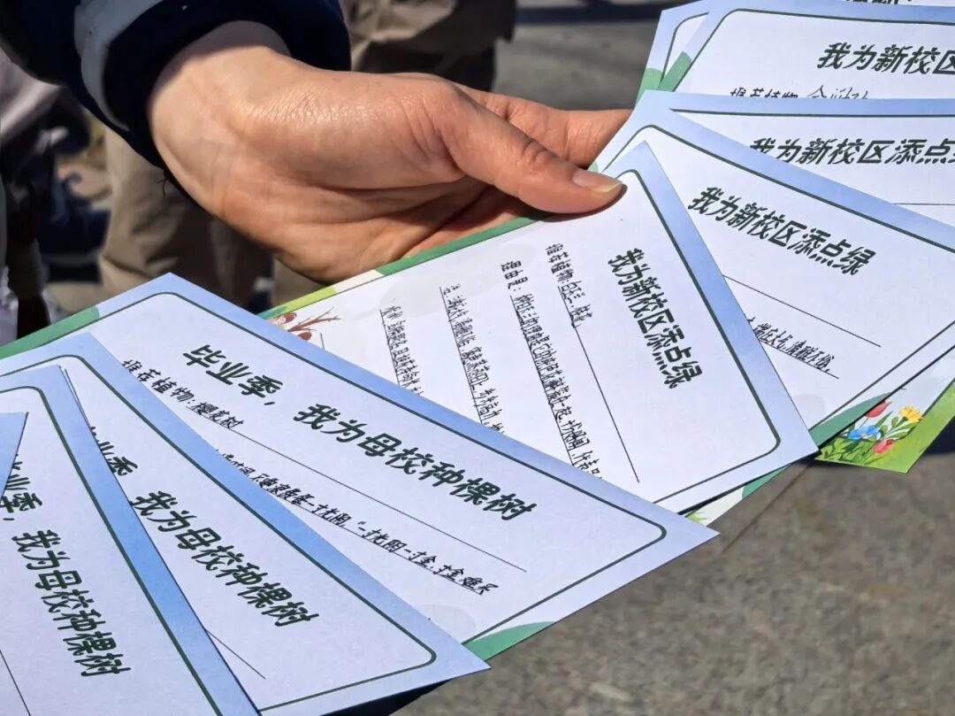 新栽的小树上,还挂着孩子们精心制作的主题卡片,围绕“我为母校种棵树”“我为新校添点绿”两大主题,装满了创意与期许。除了推荐绿植品类,学生们还提出不少贴心建议:有人留意到学校别称“葵园”,但向日葵种植面积有限,希望扩大规模;有人提议按“年级方阵”种植各班投票选出的植物,成熟后的果实可制作校园特饮……