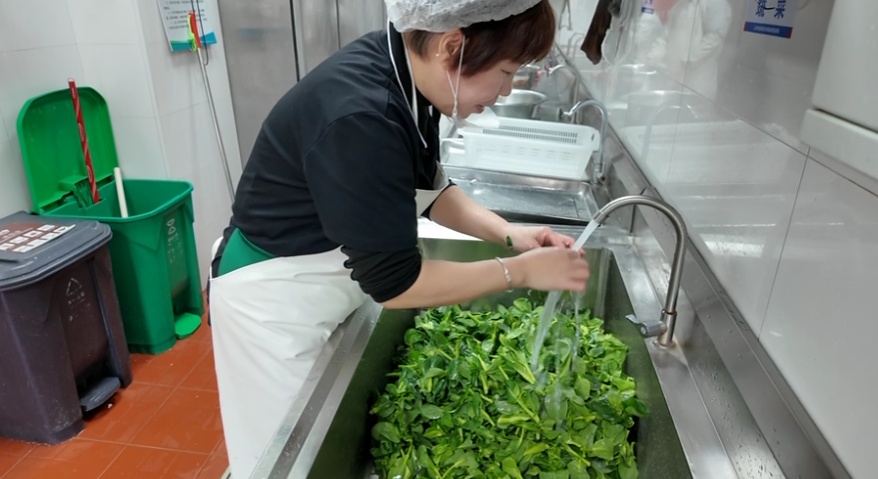 上午九点半,记者在城桥镇人民路党群服务中心社区食堂的后厨看到,苋菜翠绿、菠菜鲜嫩、春韭飘香,各类时令蔬菜整齐摆放。工作人员正分工协作,有条不紊地进行着清洗、焯烫、翻炒等工序。