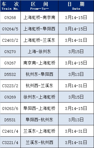 据上海铁路客户服务中心介绍,根据旅客出行需求,铁路部门增开了部分旅客列车。增开列车包括G9268(上海虹桥-南京南)、G9264/5(上海虹桥-阜阳西)等。赶快过来看看有没有您需要的车次吧!