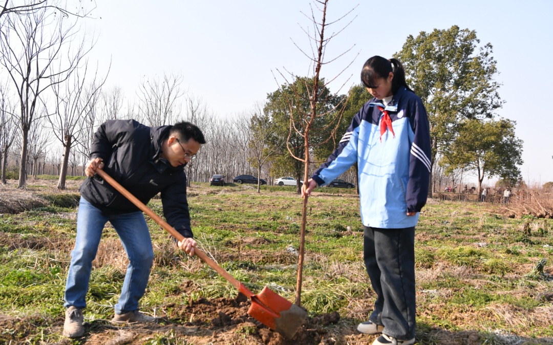 活动现场,党员干部带头挥锹铲土、扶苗压实;团员青年和少先队员干劲十足,挖坑、种树、培土、浇水一气呵成。随后,大家还在树苗上挂上定制纪念牌,标注姓名、日期与生态寄语。活动中,党员、团员、少先队员代表共同宣读《生态保护倡议书》,把生态教育从课堂搬到田间地头,让爱绿、植绿、护绿的理念落地生根。