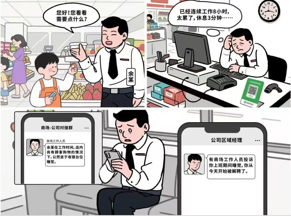 余某表示自己并未睡着,被商场工作人员投诉一事确实存在,但其当天从9:30开始上班至22:30下班,门店所有工作均由其一人完成。公司所指的“睡觉”是在当天晚上20时许,余某由于已连续工作超过8小时,因疲惫而坐在凳子上闭眼休息3分钟,实际并未睡着,且有接待进店客人。至于2024年8月闭店一事,系因当日店内仅一名店员,其上厕所期间短暂关门。
