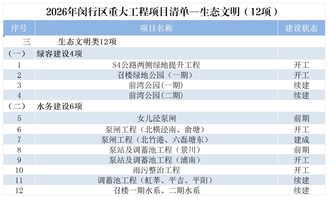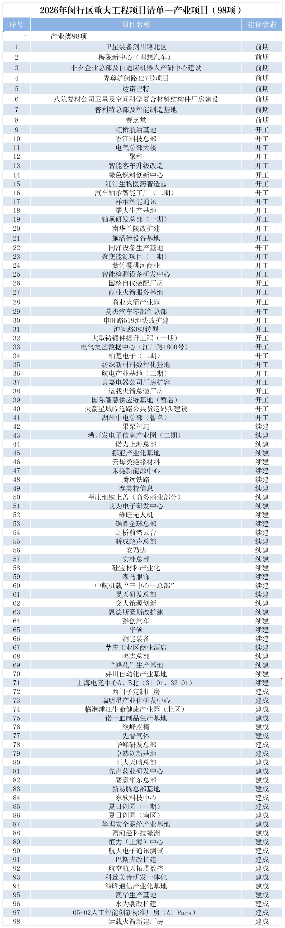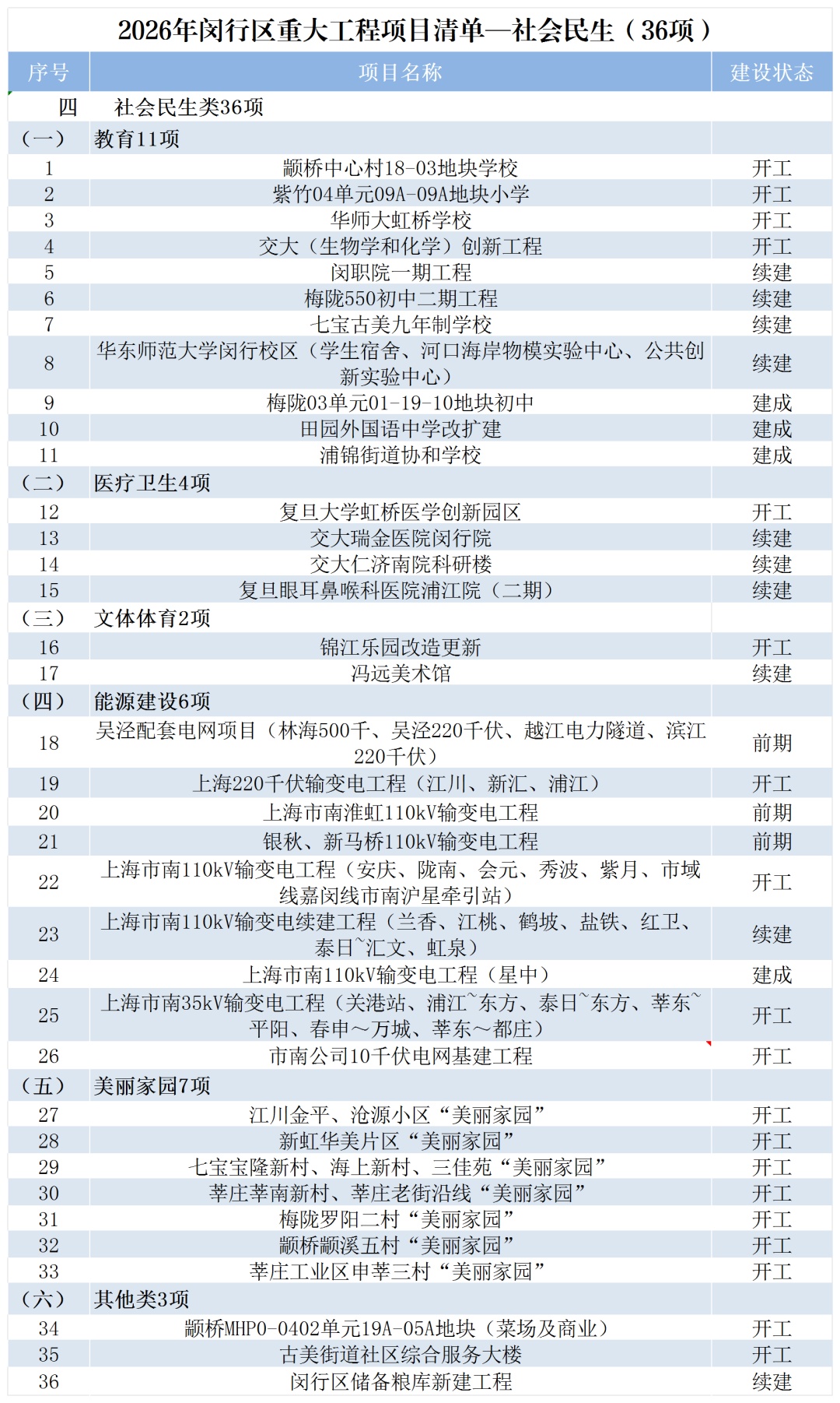 重大工程项目是筑牢区域发展根基、激活经济增长动能、增进民生福祉质感的核心支撑。2026年是实施“十五五”规划的开局之年,闵行区围绕推动高质量发展首要任务和构建新发展格局战略任务,发布年度重大工程建设计划,共安排正式项目213项,其中产业项目98项,市政交通32项、生态文明12项、社会民生36项、住房保障35项;另安排预备项目10项。详见↓