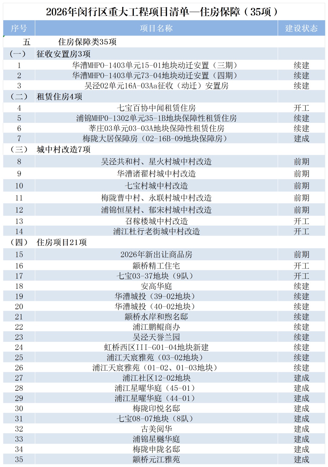 前期类6项:华漕诸翟村城中村改造、七宝村城中村改造、梅陇曹中村、永联村城中村改造、吴泾共和村、星火村城中村改造等。