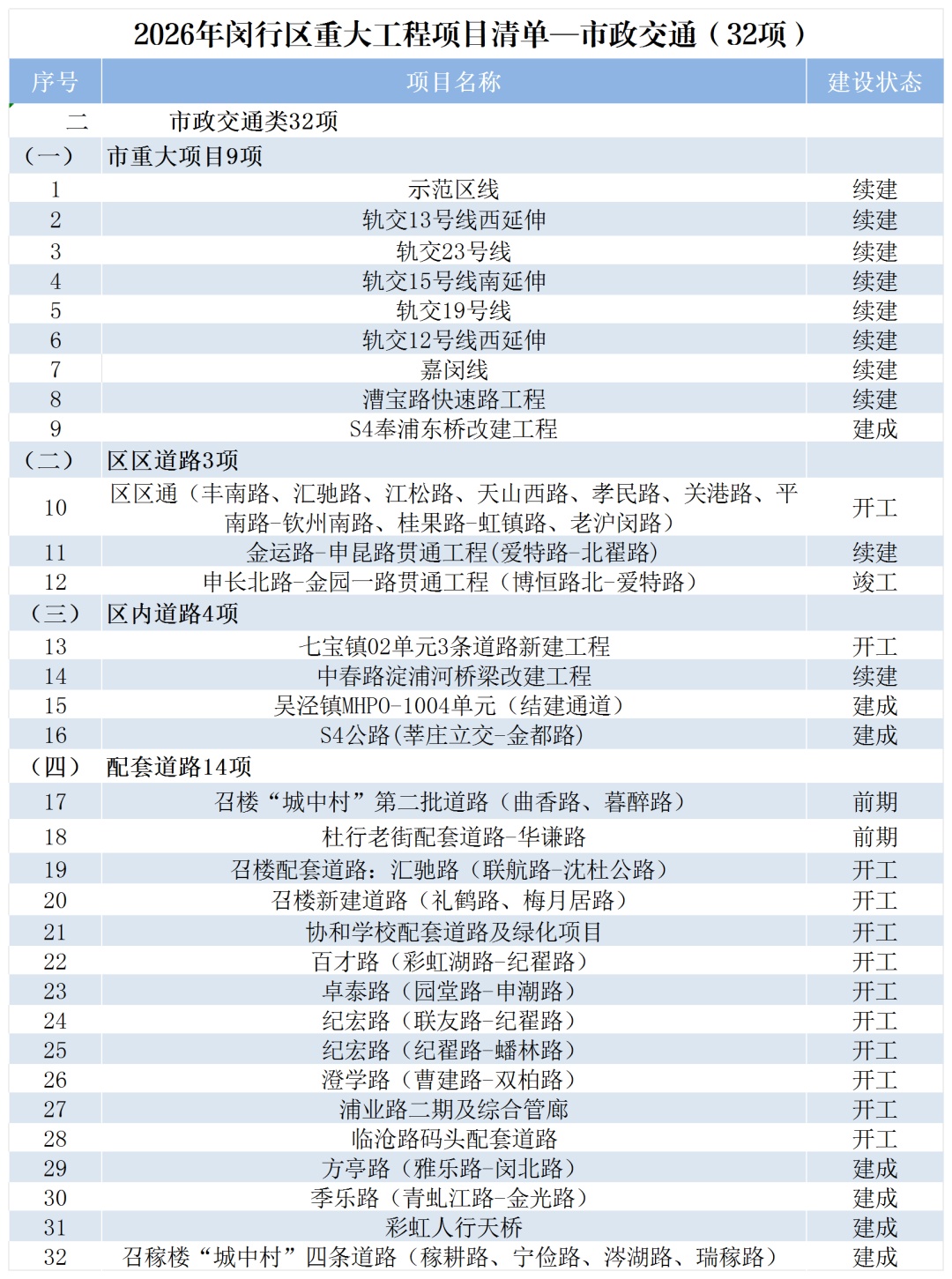 续建类10项:金运路-申昆路贯通工程、漕宝路快速路工程、轨交12号线西延伸、中春路淀浦河桥梁改建工程等。