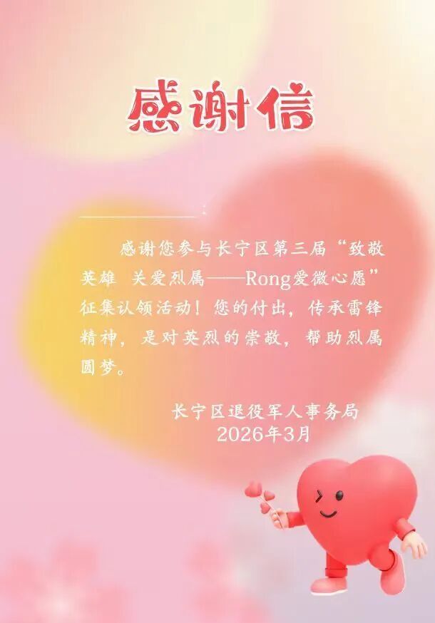 区退役军人事务局表示,今年的学雷锋活动开展期间,第三届首批“Rong爱心愿”已有9份被社会各界爱心人士认领,期待更多的爱心企业和爱心人士接力认领“Rong爱心愿”。