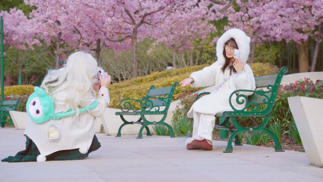 花树下,早已是人头攒动。摄影爱好者们架起“长枪短炮”,或仰拍花枝与蓝天,或捕捉花瓣飘落的瞬间;年轻的姑娘们身着好看的衣裳,在花树下顾盼生姿;阿姨们则结伴而来,披着丝巾、摆着pose,笑称“要把春天的颜色带回家”。“随手一拍就是大片,根本不用修图!”正在和朋友合影的市民李小姐兴奋地说,她已经在朋友圈发了九宫格,“点赞都刷屏了”。